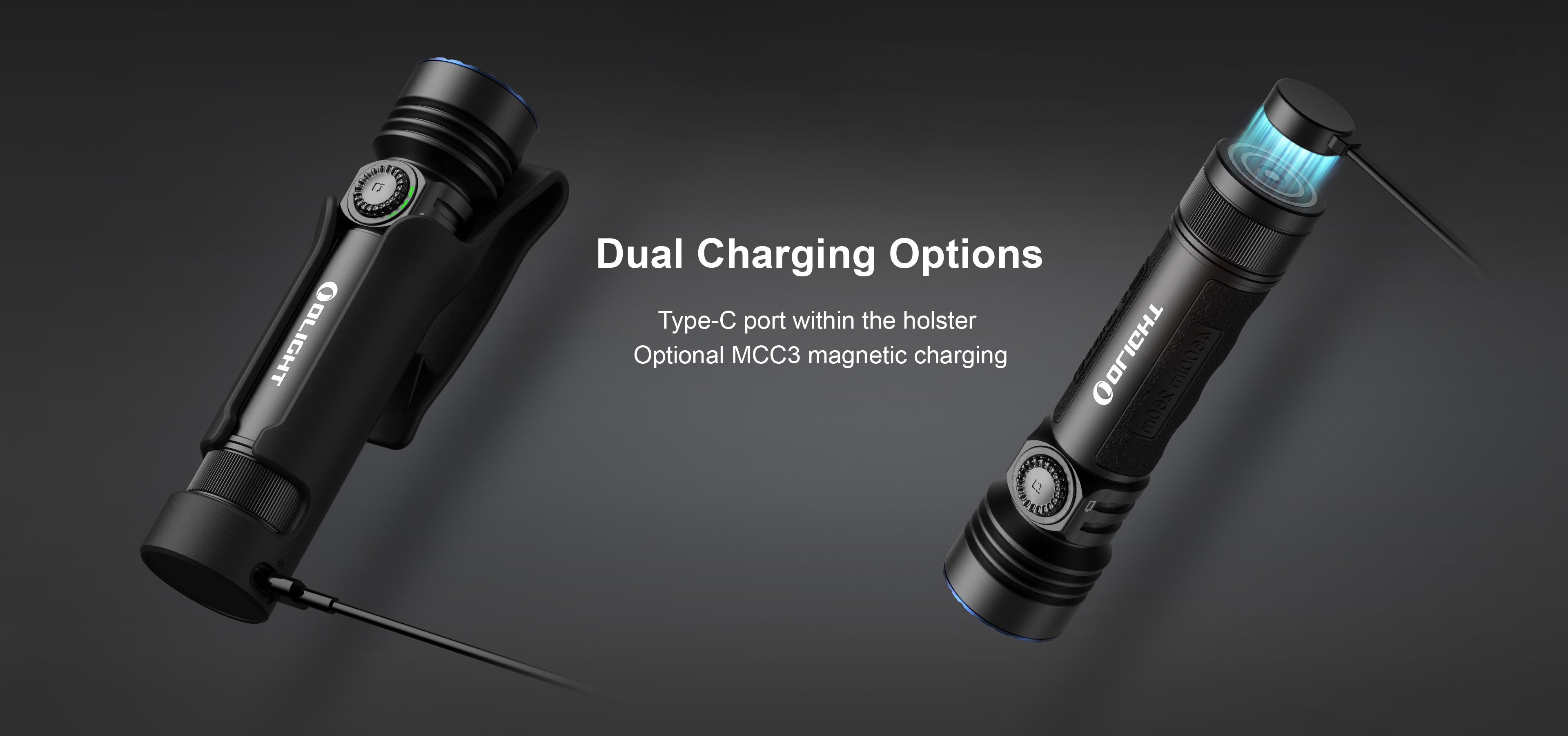 . The holster also has a built-in USB-C port to charge the flashlight USB-C charging with holster, or magnetic charging with an optional MCC3